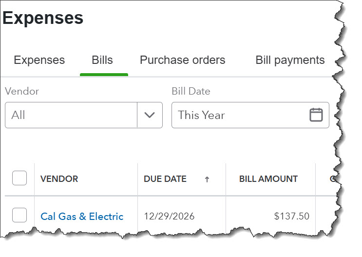 QuickBooks Online devotes an entire section to payables. Click Expenses in the toolbar to see the types of transactions (Expenses, Bills, etc.), records (Vendors, Contractors), and other tools (Mileage, 1099 filings) covered there. Once you’ve created vendor records, you can enter details for individual or recurring bills and mark them as paid once you’ve sent a check. All bills—paid and unpaid—appear in registers, so you can easily see their status.